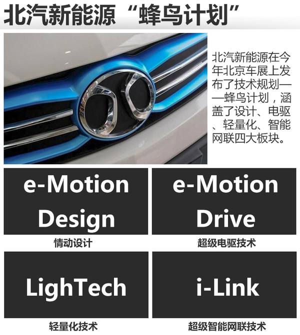 北汽新能源在北京车展上发布了蜂鸟计划,涵盖“e-Motion Design情动设计”、”e-Motion Drive超级电驱技术”、“LighTech超级轻量化技术”、“i-link超级智能网联技术”四大核心技术,通过各研发中心的深度整合,已逐步应用到EU260、EX200等新一代车型中,将进一步增强竞争实力。