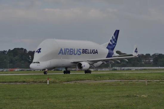 下图就是负责运送大部件的运输机,萌萌的机身,被称作空客大白鲸(BELUGA)。