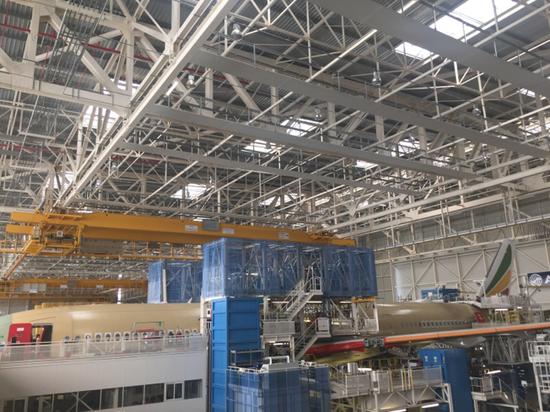 空客公司的工作人员告诉记者,一架空客A350飞机从开始总装到交付客户所需的时间约为2.5个月,这比其他项目节省了30%的时间,空客的生产目标是,到2018年每个月可以总装10架A350客机。
