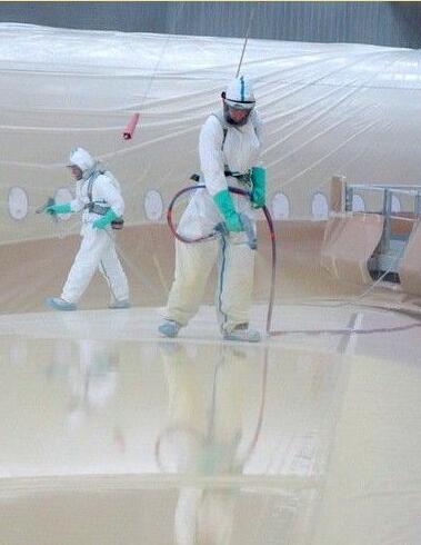 再下一步是对飞机喷漆。在图卢兹,有4个宽体飞机(A330/A350WB/A380)的喷漆机库。其中3个在Clément Ader园区,另一个在Jean-Luc Lagardère园区。喷涂的油漆完全符合相关环保规定,采用低聚氨酯油漆和低挥发性有机物(VOC)溶剂。喷漆时采用带静电喷涂系统的喷枪,它可以使喷涂更均匀,用漆量减少,相应地可以减轻飞机的重量。