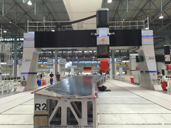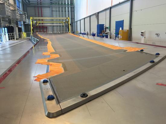 参观过程中,记者也看到了A350机翼上蒙皮的制造过程:先是通过自动铺层机制造机翼上蒙皮,一般需要5个工作日;然后在180摄氏度的热压罐中热压12小时;之后是第二次热压、表面保护措施、质量检验等,总的生产时间在50个工作日左右;后运送到空客汉堡厂区,再通过大白鲸运输机运往英国布劳顿进行机翼组装。