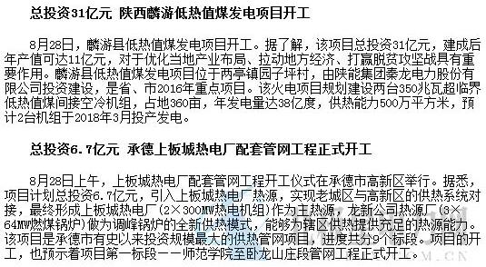 9月18日,甘肃平凉中心城区热电联产集中供热二期项目开工,项目建设至2020年,供热覆盖面积1200万平方米,并与一期工程形成功能互补,解决泾河两岸和集中供热一期工程未覆盖区域的供热问题,有效提高城区供热质量。同时,中心城市共可以关停约300台供暖燃煤锅炉,减少烟尘排放,缓解环境污染问题。二期项目估算总投资为5.95亿元,主要供热区域为泾河两岸及主城区一期工程未覆盖区域。工程将敷设一级供热管网51.56公里,新增热力站93座。