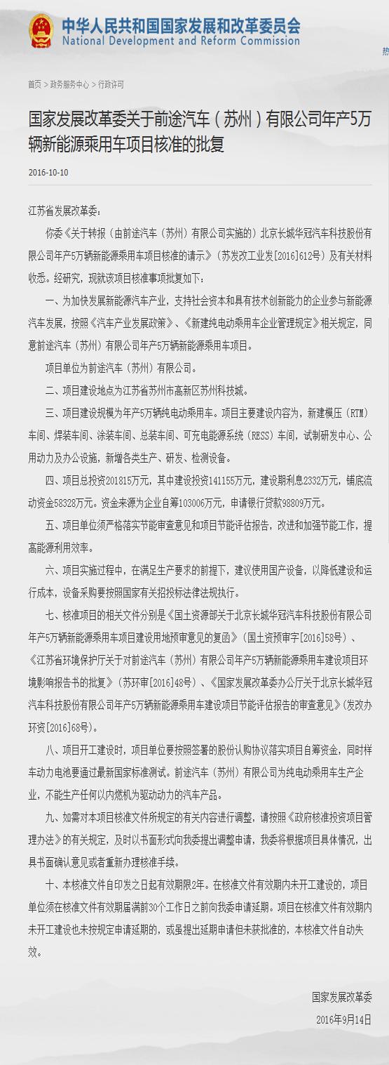 10月10日,北京长城华冠汽车科技股份有限公司年产5万辆新能源乘用车项目获得发改委批准。继北京新能源汽车股份有限公司和杭州长江乘用车有限公司之后,长城华冠成为第三家获得新能源乘用车生产资质的企业。
