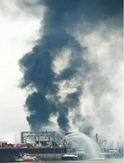 爆炸大约发生在中午11点30分。当时,一些工人正在厂区北部的装卸港口进行管线作业。爆炸发生后,周边地区的消防队都被调集灭火。