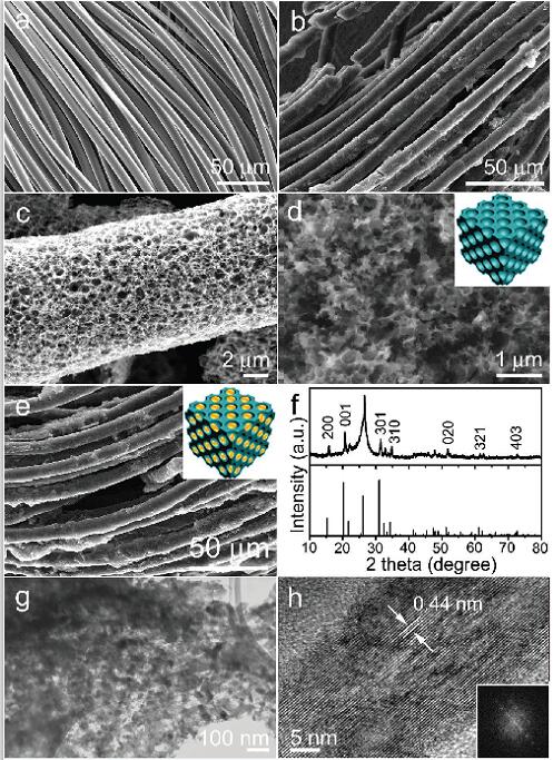 (e) V2O5/3DC-CF复合物的SEM图,内部插图为V2O5/3DC复合物结构示意图;