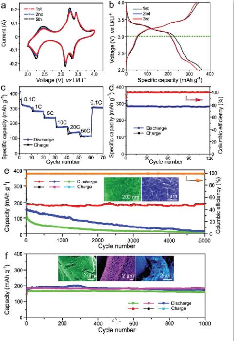 V2O5/3DC-CF复合物成功的合成用作锂离子电池负极材料,该复合材料的特殊组成和结构设计使V2O5纳米粒子有效的负载其上,这提高了电子和粒子的传输效率,另一方面,3DC-CFs由于没有粘结剂和导电材料的添加而可以直接作为集流器使用。V2O5/3DC-CF复合物优异的电化学性能使其有望成为高性能锂离子电池负极材料的替代品。