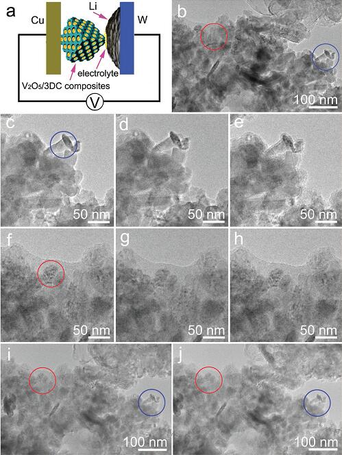 (b)锂离子嵌入前的V2O5/3DC复合物的TEM图,红色和蓝色圈分别显示的是在3DC阵列的内部和边缘的V2O5纳米粒子;