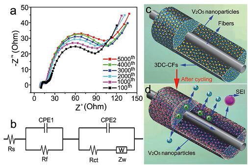 (b)V2O5/3DC-CF复合物电极的等效电路模型,Rs为电解液电阻,CPE1和Rf分别是电极表面钝化层的电容和电阻,Zw是和锂离子扩散进入电极相关的Warburg阻抗;