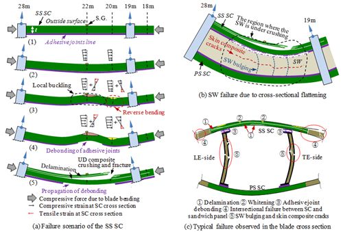 图2 弯扭耦合荷载下大型风电叶片结构破坏机理示意图