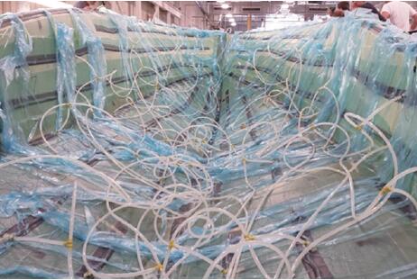 准备灌注时,工程安装了一次性真空袋,紧紧固定到模具法兰以防止漏气。然后根据船体将要灌注的区域,加入一系列已数字编码的树脂灌注线。