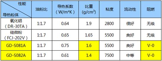 表1:GD-S081A、GD-S082A与氧化铝、硅微粉制备的灌封胶各项性能对比