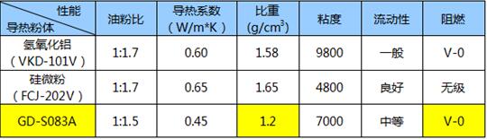 下表是GD系列低比重导热粉GD-S081A、GD-S082A、GDS083A与氧化铝系列、硅微粉系列和氢氧化铝系列制备的灌封胶性能参数对比,其中乙烯基硅油粘度为450cps。