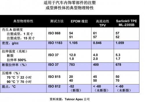 上图为新型化合物与 EPDM 和 TPV 的物理特性对照表