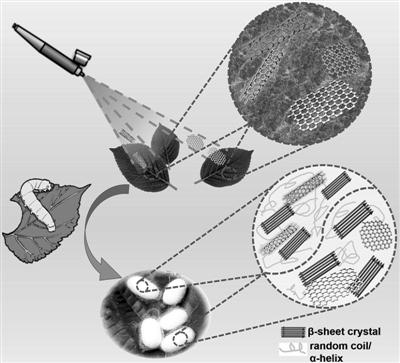 科研人员将含有碳纳米管或者石墨烯的水溶液喷涂在桑叶上,用于喂食蚕虫,终得到复合了碳纳米管或者石墨烯的蚕茧。