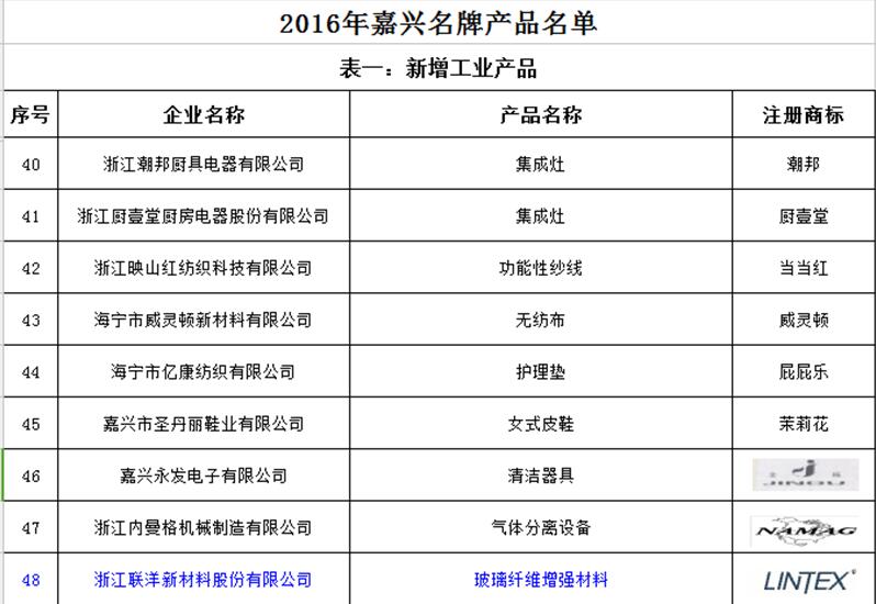 根据《嘉兴名牌产品认定和管理办法》的规定,通过资格审查、行业综合评价、由嘉兴名牌产品认定委员会审议并向社会公开征求意见后,近期发布了《2016年嘉兴名牌产品公告》,联洋新材公司玻璃纤维增强材料被评为2016年嘉兴名牌产品,这是对联洋新材的充分肯定与鼓励,联洋新材公司将扎扎实实做好员工培训、技术创新、内部控制和市场拓展等品牌基础工作,持续贯彻品牌战略,提高品牌的知名度和美誉度,持续为客户提供更高性价比的产品和服务!