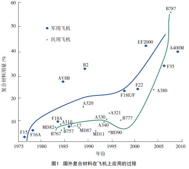 通过上述计划的实施,大幅提升了复合材料在飞机结构上的用量,F35 复合材料用量达到结构重量的36%,A400M 达到40%,波音787 达到50%,空客A350 达到52%
