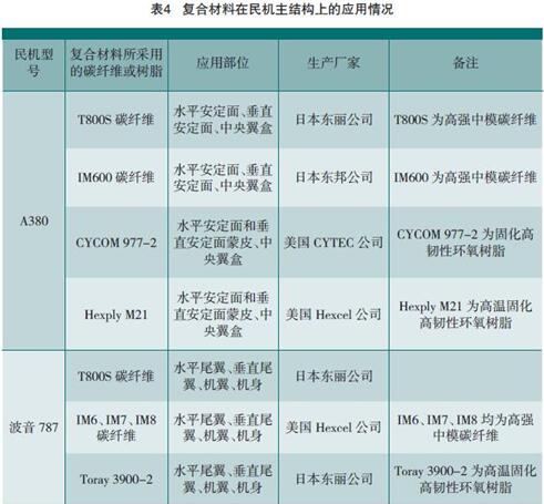 高性能碳纤维及高韧性树脂复合材料的出现,使复合材料在飞机结构上的应用已由原先的次承力结构发展到机翼、机身等主承力结构。复合材料在民机(以波音787 和空客A380 大型客机为例)主结构上的应用情况如表4 所示。从表4 可以看出,国外民机主结构在选材上采用了由T800 或相当于T800 的高强中模碳纤维与高温固化高韧性环氧树脂复合的高韧性复合材料,以满足复合材料主结构的设计损伤容限要求。