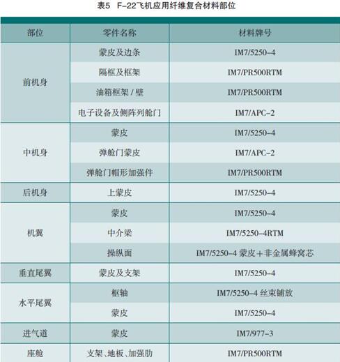 复合材料在军机(以F-22 为例)主结构上的应用情况如表5 所示。从表5 可以看出,美国军机主结构在选材上采用了由IM7 高强中模碳纤维与高温固化高韧性环氧树脂复合的高韧性复合材料,以满足复合材料主结构的设计损伤容限要求。