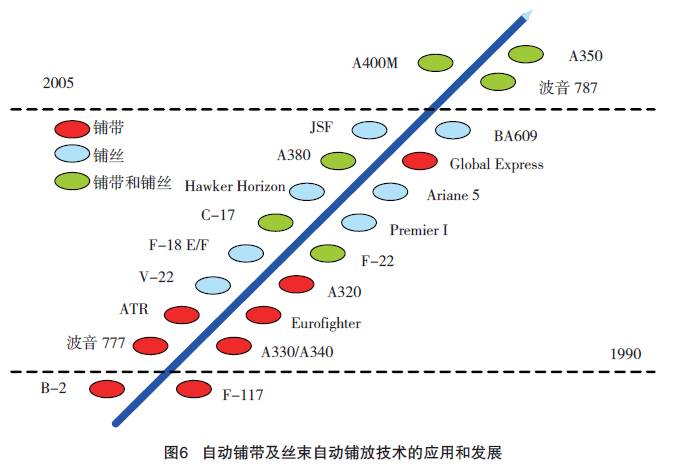 国外采用的自动化制造技术主要有自动铺带、丝束自动铺放等技术,是大型复合材料壁板及复合材料机身筒体制造的唯一手段,并显着提高了复合材料生产效率和制件内部质量,降低了成本,使复合材料性能优化和低成本并存成为可能。图6 表征了自动铺带及丝束自动铺放技术的应用和发展情况。