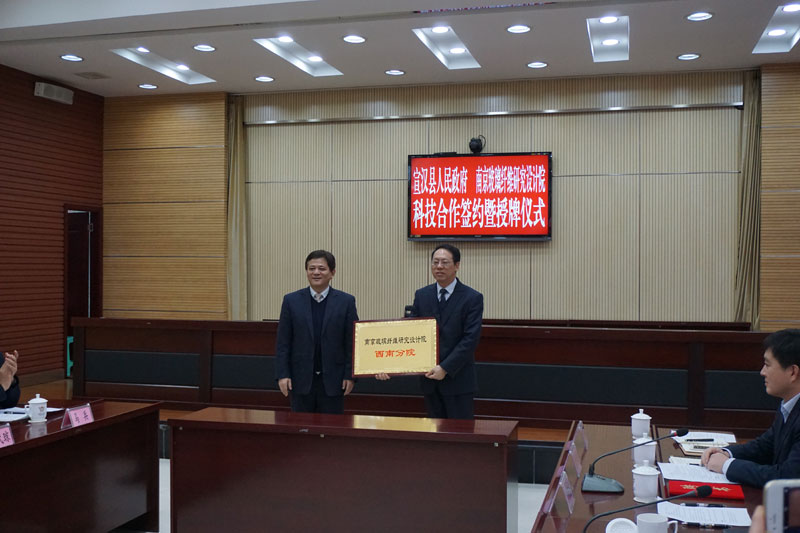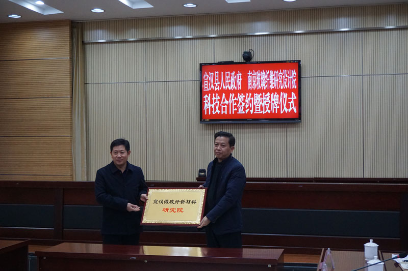 签约仪式上,董事长赵谦与宣汉县县长冯永刚签署了合作协议,宣汉县副书记罗宾宣读了宣汉微玻纤新材料研究院的成立文件,院党委书记郭伟宣读了南京玻纤西南分院的成立文件,董事长赵谦、宣汉县委书记分别向西南分院与微玻纤新材料研究院授牌。同时,宣汉县政府还聘请南玻院副总经理、总工程师于守富任宣汉县经济发展顾问,聘请南玻院市场规划部部长李青任宣汉县微玻办副主任,并颁发聘书。双方将围绕玻璃微纤维的生产制造、应用开发及检测认证等业务开展全方位的科技合作,由政府搭台、南玻院受托运营的方式将宣汉微玻纤新材料产业园建成科研创新的平台、招商引资的平台、人才集聚的平台、产业发展的平台,在微纤维新材料的全产业链上进行布局,力争将产业园打造成有特色的级创新孵化园区,实现互利共赢的美好愿望。