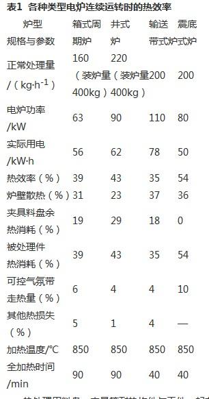 日本统计的各种类型电炉连续运转时的热效率如表1所示。从表1中的数据可以看出,井式炉吊具热能消耗量大,箱式炉和输送带式炉次之,输送带式炉的输送带很长,加热后冷却又重新入炉加热,无效热能损失大。而震底式炉的炉底板一直在炉膛做往复运动,因炉内不使用料盘,故没有这方面损失。因此,尽可能用震底式炉、辊底式炉和网带炉代替链板炉或铸链炉,免除料盘的热损失,降低成本。