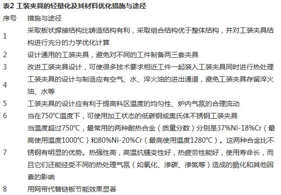 热处理用料盘、夹具等耐热构件与工件一起在炉内加热,随工件冷却后,重新装上工件再次加热。这是必须付出的能量消耗,但在保证其强度和寿命的前提下,如能大程度地减轻其重量,就可以减少用于料盘、夹具上的能源消耗,可多装工件,提高效率,显着降低能源。从这个角度,采用高级、较昂贵的耐热合金钢,甚至金属间隙化合物材料、碳/碳复合材料、石墨材料使料盘、夹具轻量化还是经济的。有采用高级合金减轻料盘、夹具重量有节电20%的记录。