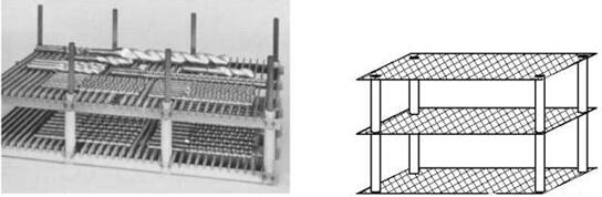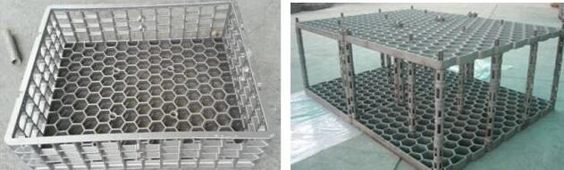 (1)美国使用碳/碳复合材料代替耐热钢制作料架,不仅减轻了料架的重量,而且降低了能耗。料架和栅格的常用制作方法包括结构组合(见图3)和压接(见图4)。碳/碳材料和合金料筐或丝网混合使用也常见。