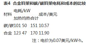 表4为合金料架和碳/碳料架电耗和成本的比较。使用碳/碳料架因节省用电而使用电成本降低1.33美元;若真空炉成本以每小时187美元计算,则因缩短生产时间(节省总周期时间45min)而使每炉次节省了140美元。