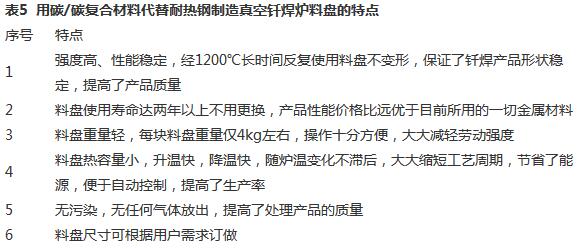 科学院金属研究所生产900mm(长)×650mm(宽),厚度10~30mm范围内的各种碳/碳材料制真空钎焊炉用料架,已经大量用于生产,因其重量轻,减少了额外能源消耗。其特点如表5所示。