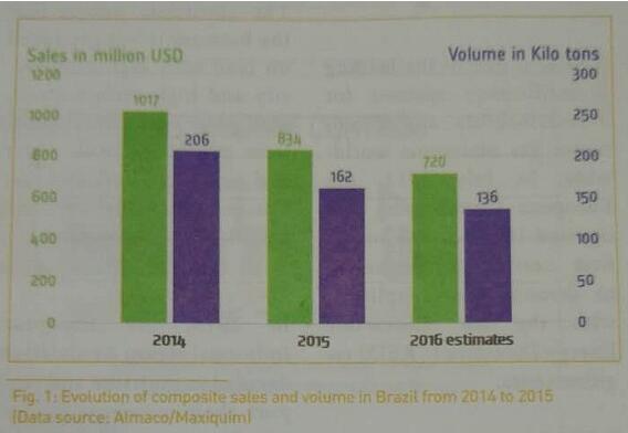 巴西杯和夏季奥运会饰巴西的经济萧条和政治动乱。拉丁美洲复合材料协会(Almaco)和化工行业市场咨询顾问公司Maxiquim估计2016年巴西复合材料市场的销售额将会下降至72亿美元,或者比2015年下降13.67%。销量也应该下降到13.6万吨,下降16.05%。