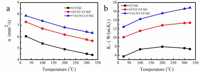 图2. 不同温度下VACNT-CF/SiC、ECNT-CF/SiC和CF/SiC沿厚度方向的(a)热扩散系数以及(b)导热率