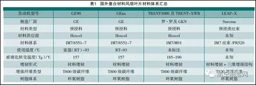 国外适用于复合材料风扇叶片的材料体见表1。