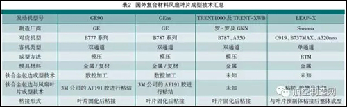 国外目前主流的复合材料风扇叶片成型技术主要包含模压及RTM 注射成型,分别对应的发动机及机型见表2。