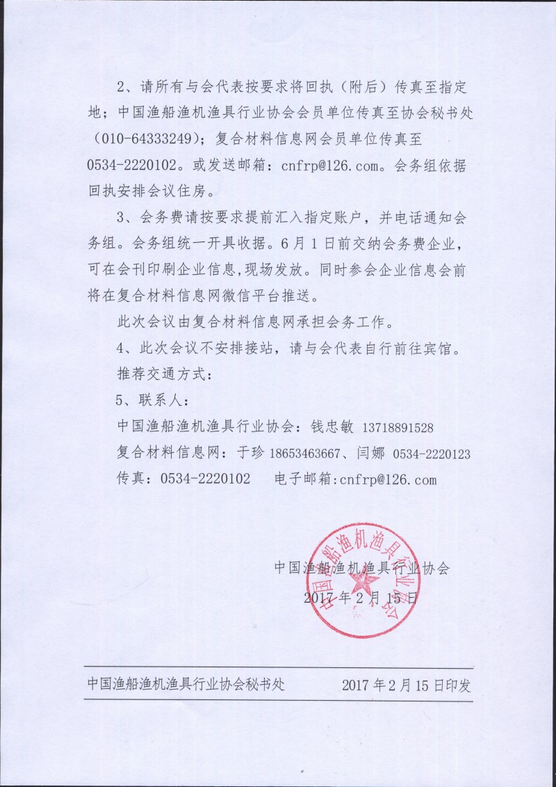 2、请所有与会代表按要求将回执(附后)传真至指定地;渔船渔机渔具行业协会会员单位传真至协会秘书处010-64333249;复材网会员单位传真至0534-2220102。或发送邮箱:cnfrp@126.com,会务组依据回执安排会议住房。