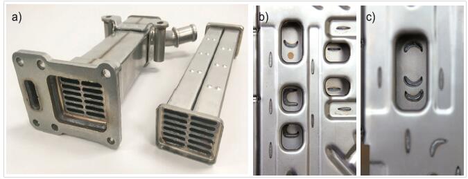 图2. 汽车总成需要将一组管子的末端焊接到一个较大的结构 (a)。(b) 例所示为大型(约 30 × 60cm)汽车座椅结构,这是一个多层结构,要求在顶部进行焊接,并通过孔焊接到部件的底层 (c)。