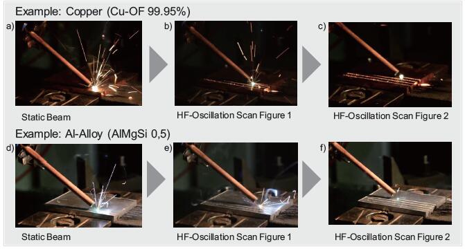 图3. 无光束摆动 (a) 和有光束摆动 (b) 的纯铜焊接飞溅情况观察结果,摆动优化显示无焊接飞溅 (c)。(d-f) 所示为对铝材进行光束摆动应用的效果,焊接飞溅减少。(图:德国德累斯顿 Fraunhofer IWS 以及 SCANLAB)。