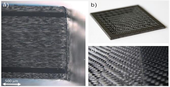 图5.单向 (UD) 碳纤维增强复合材料 (CFRP) 刻蚀,UD CFRP 切割边缘质量显示非常少的热影响区域 (a),CFRP织物刻蚀与切割实例 (b) 以及CFRP织物样本刻蚀各步放大图像 (c)。