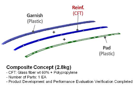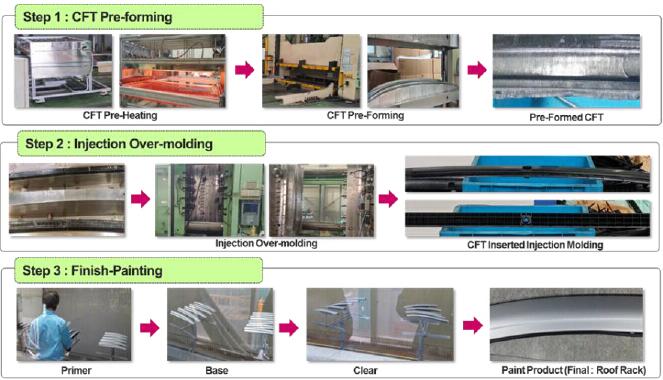 该项目旨在通过使用连续纤维增强塑性(CFT)复合材料来降低车顶行李架的重量和成本。为了实现这一目标,LG华奥斯公司研发了一种制造工艺,这种聚丙烯和玻纤维制成的CFT先被预成形为想要的形状,叠注塑肋条,它将增加行李架的刚度。后一步,成形的车顶行李架用一种新的表面处术刷漆。