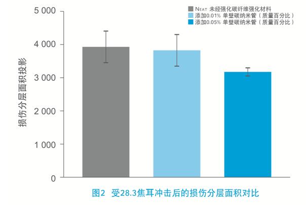 未经强化的碳纤维强化复合材料的平均分层面积为3940±470 mm2,相对添加0.05%(质量百分比)单壁碳纳米管强化的材料,平均分层面积为3180±130 mm2,减少了19.3%(图2)。