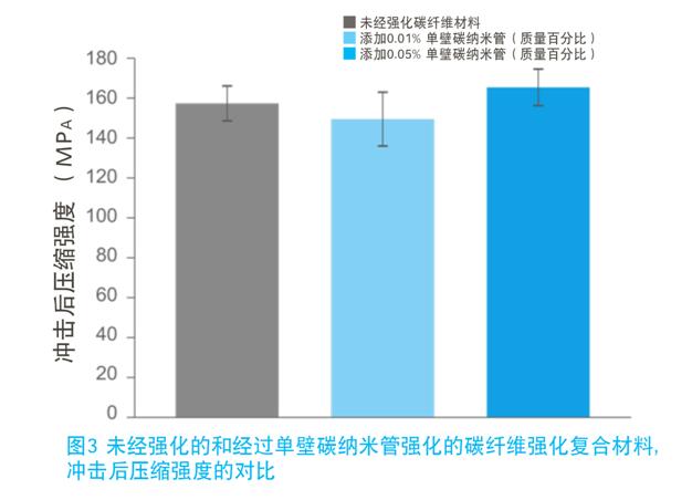 此外,应该提及到冲击试验后的压缩强度,这与航空应用高度相关,测试表明经过0.05%(质量百分比)TUBALL纳米管强化的材料,可增加约5%的冲击后压缩强度(图3)。通过优化材料,未来的发展将展现更好的效果。
