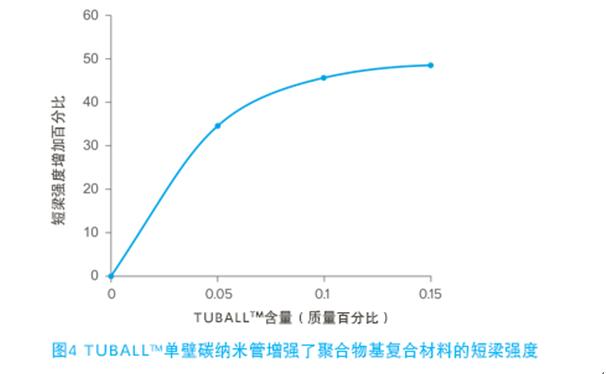 根据ASTM D2344/D2344M-16标准,OCSiAl公司对经过TUBALL单壁碳纳米管强化的、玻璃纤维增强聚酯SMC(片状模塑料)复合材料进行了层间剪切强度试验,试验表明,添加0.05%(质量百分比)的TUBALL单壁碳纳米管时,聚合物基复合材料及其层压材料的短梁强度提高了34%,而添加0.1%(质量百分比)的TUBALL则增加了45%(图4)。
