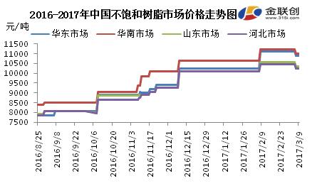 由上表可直观看出,近两年国内不饱和树脂市场限制进一步扩产进展明显,但若2017年国内不饱和树脂计划扩产能够如期完成,那么2017年整体供过于求现状将越发明显,在供应过剩的影响下,不饱和树脂市场不排除或出现“价格战”等衍生现象,那么不饱和树脂市场价格方面将进一步趋于“白热化”。