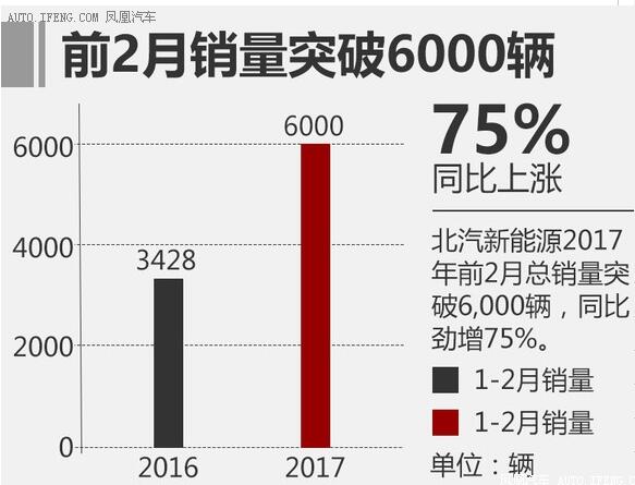 但传闻终归是传闻,网通社从北汽新能源官方获悉:北汽新能源2017年2月销量达4,000辆,同比增长127%;1-2月总销量更是突破6,000辆,同比劲增75%,为2017年开了一个好头。