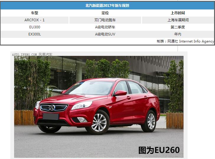 除EU300外,北汽新能源ARCFOX品牌的款车型ARCFOX -1将于下月开幕的上海车展期间上市,而续航里程为300公里的紧凑型纯电动SUV——EX300L也将于年内正式投放市场。