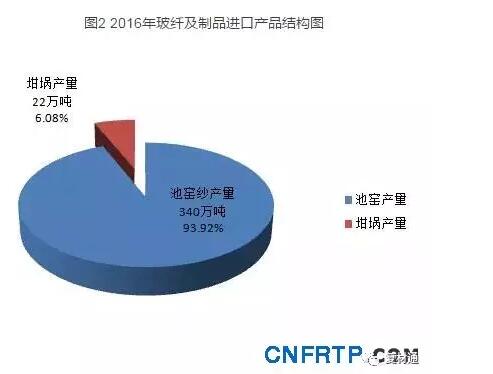 2016年,全行业玻璃纤维纱产量362万吨,同比增长12.07%。其中:池窑纱产量340万吨,同比增长11.66%,占玻纤纱总产量的93.92%;坩埚拉丝产量22万吨。玻纤行业产能增长主要集中于三大池窑企业,受风电、热塑及覆铜板行业需求的拉动,行业产能利用率提高,产量稳中有增。(2016年玻璃纤维纱产能结构见图1)