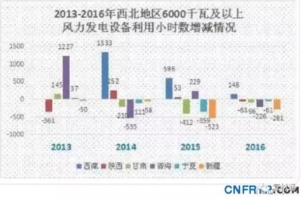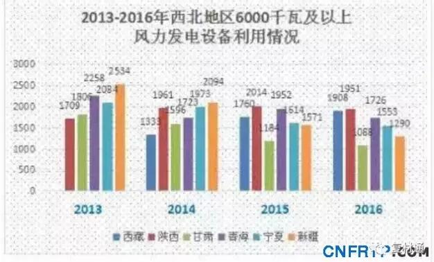 综合数据显示,西北地区已经成为我国风电设备平均利用小时数下滑为严重的地区。除了西藏之外,其余省份均已经连续三年大幅度下滑。