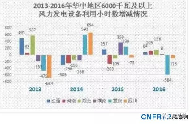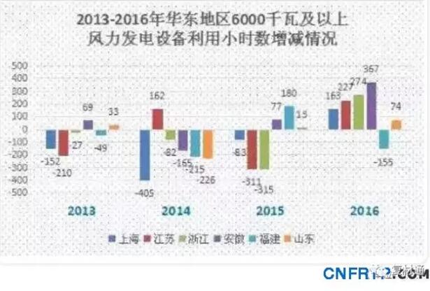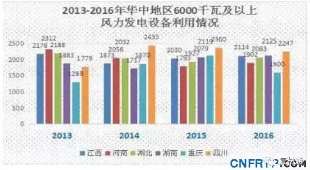 该区域风电设备平均利用小时数优于2015年,仅仅福建省的风电设备平均利用小时数出现了下滑。由于该地区风电场距离负荷区较近,2016年华东地区风电设备平均利用小时数总体均高于平均水平。