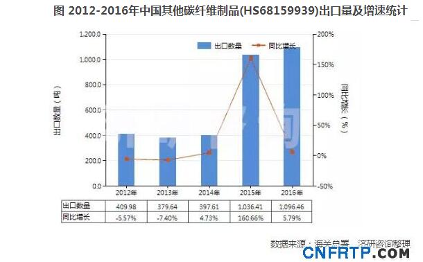 2012-2016年我国其他碳纤维制品(HS:68159939)出口量年复合增长率为27.88%。详见下图:
