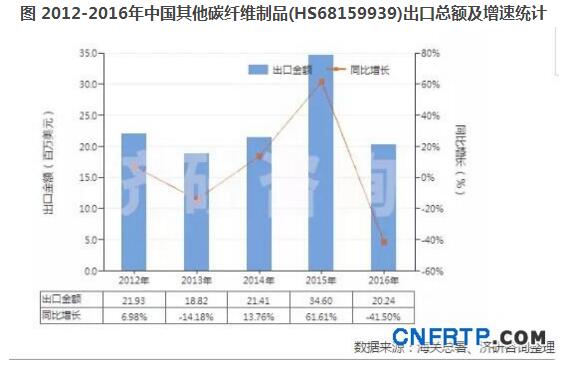 从进口额方面来看,济研咨询数据显示,2012-2016年我国其他碳纤维制品(海关编码:68159939)进口金额年复合增长率为8.30%。