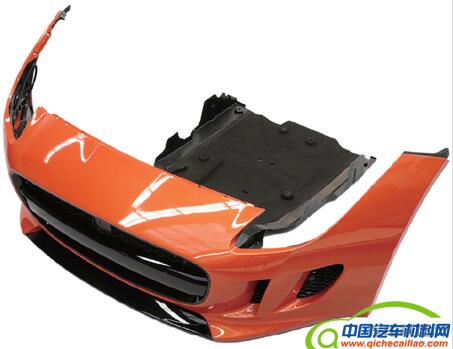 捷豹F 型前保险杠和车身底板组件基本上由三部分组成:(橙色)保险杠,(黑色)保险杠下侧(由直接注射成型滑石粉增强聚丙烯制成)和(也是黑色)新前车身底板,这是汽车低的部分,因此承受的负载大,如果汽车打到砾石或者溅到水花的话(图片由POLYTEC 集团提供)。